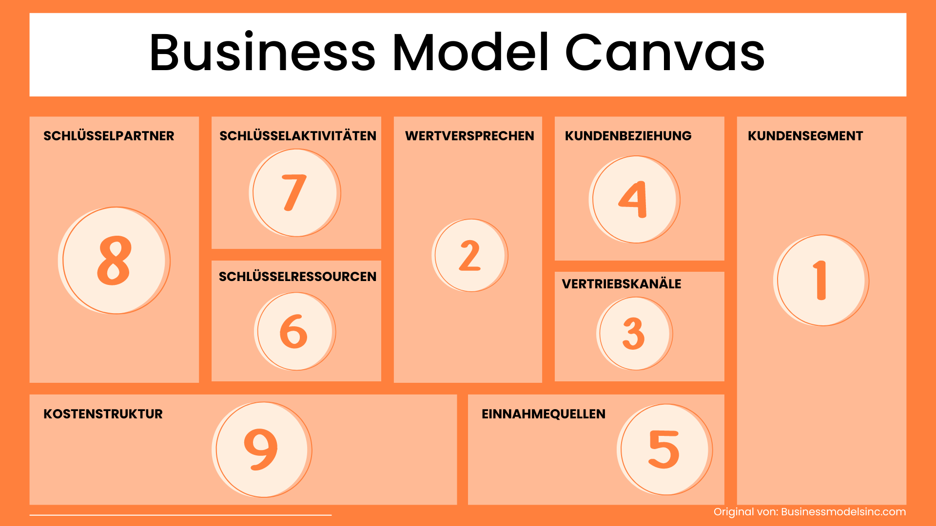 Kundensegmente, Wertversprechen, Vertriebskanäle, Kundenbeziehung, Einnahmequellen, Schlüsselressourcen, Schlüsselaktivitäten, Schlüsselpartnerschaften, Kostenstruktur.